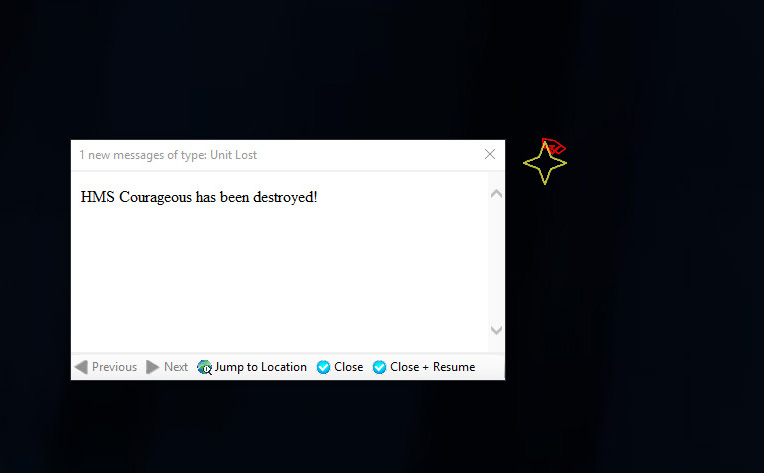 Courageous sinksThat doesn't work either. The depth charge sinks Courageous. And with her went my best hopes of even finding the Kiev.Conclusion