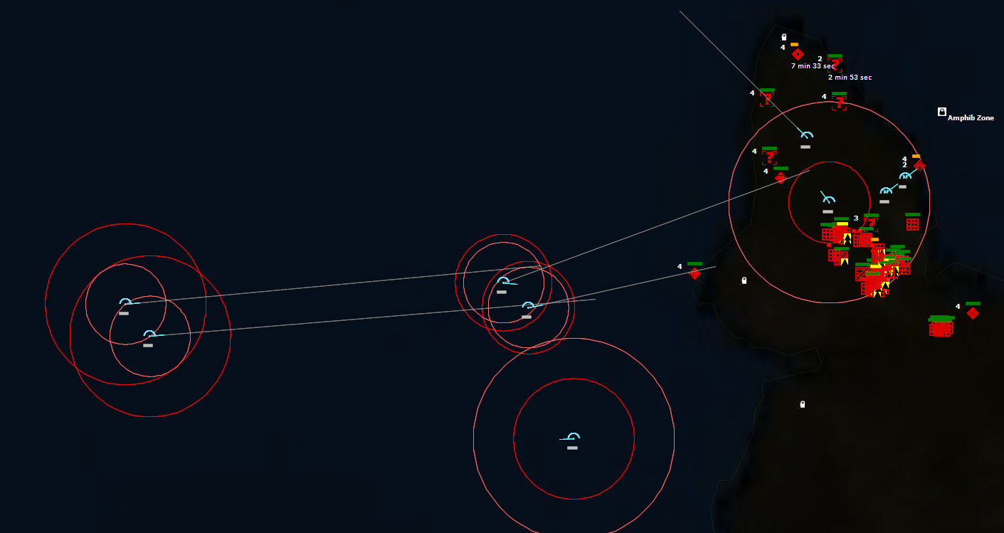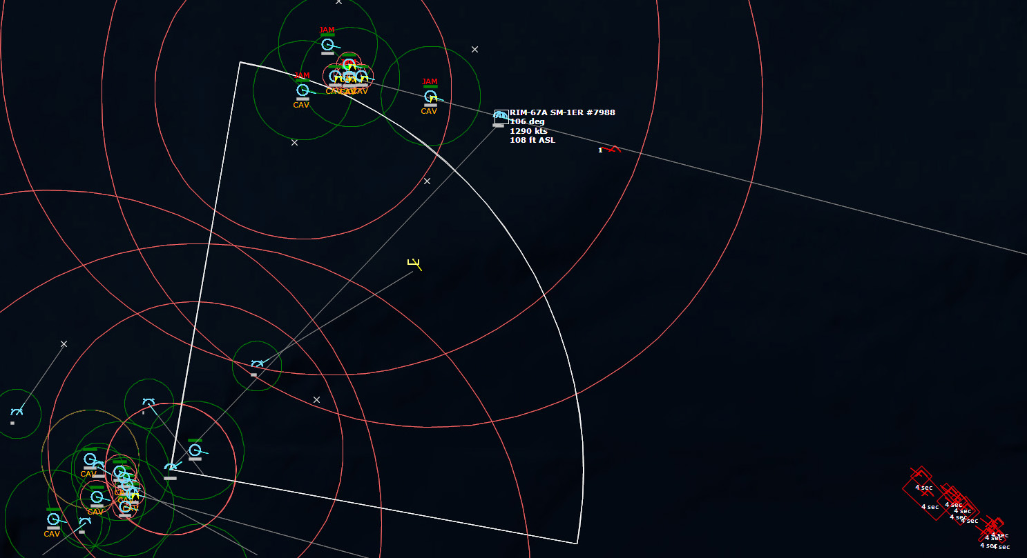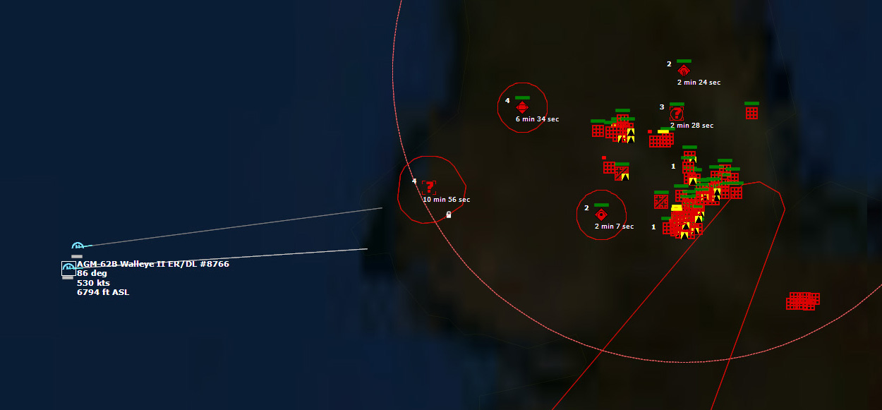 Cruise missiles close in on the Oriskany group, while a massive new raid approaches from the eastThe leading two cruise missiles veer off course and go into search mode, fortunately their course is nowhere near the Oriskany. SAMs launched from USS Dale shoot down one, and the second apparently self-destructs...in a 200kT nuclear fireball!
