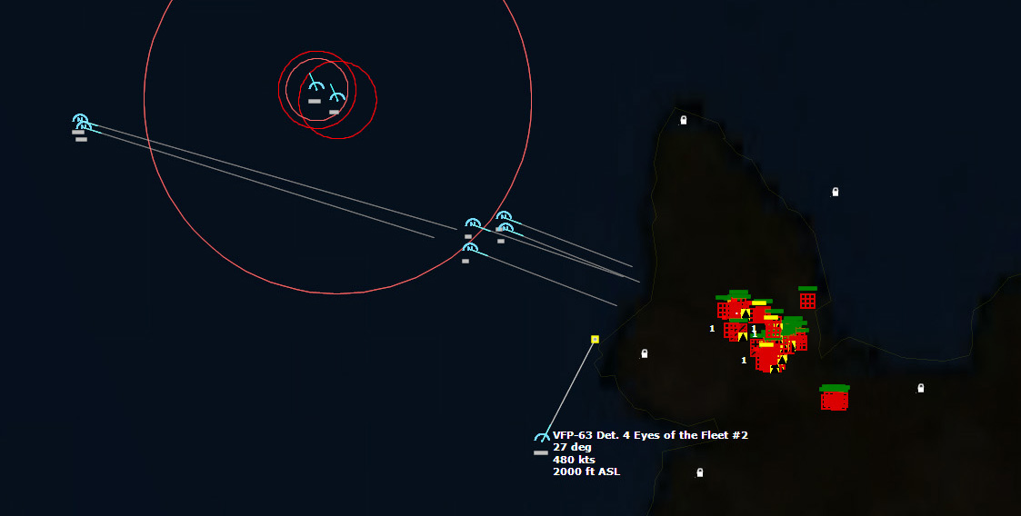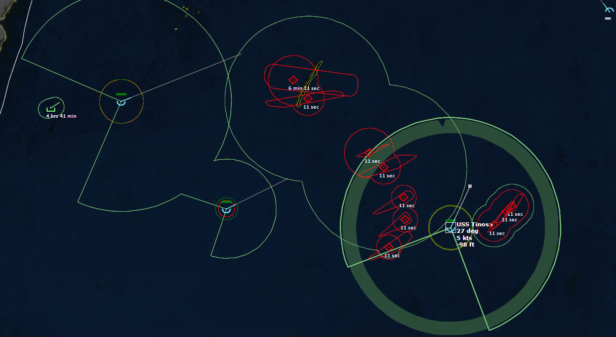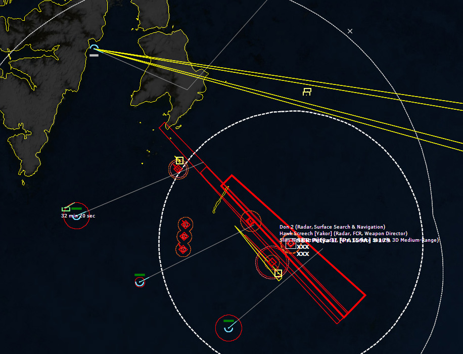 Four surface groups, but no Kiev...yet.For the next two hours, my Rivet Joint circles the surface groups, attempting to keep its distance, but there's no sign of the Kiev. I do detect more Yaks in the air. Again I keep my distance, and the Yaks, although they pursue me, eventually give up. An hour after that, more Yaks. I am beginning to suspect that the Kiev is in fact here, but keeping emissions silent, hoping to slip by.
