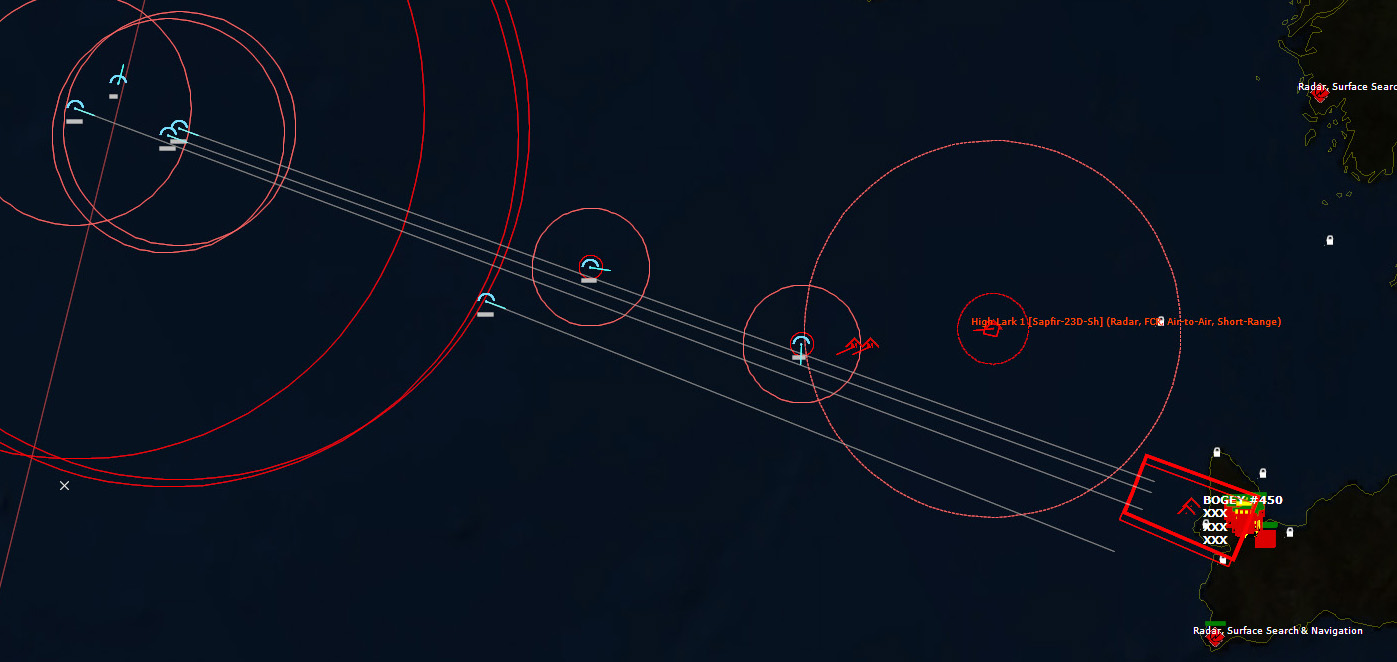 Position updatedAs my Rivet Joint gets closer, it picks up more contacts. Several are identified as SKR Petya II corvettes. 055149Z Contact! My Rivet Joint picks up two airborne bogeys--probably Yak-38 Forgers from the Kiev. Hopefully they haven't picked up my Rivet Joint.