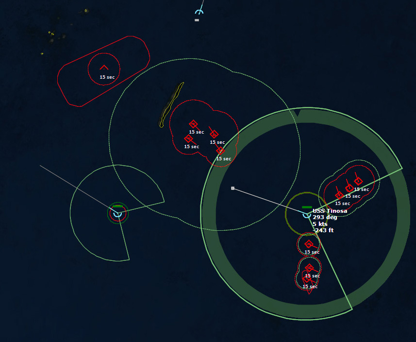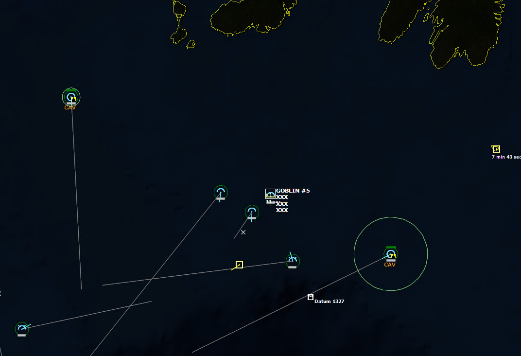 Initial positionsFrom northwest to southeast my submarines are USS Narwhal, HMS Courageous, and USS Tinosa. Almost immediately Narwhal detects a contact to the north. I set all three subarmines to 5kts, creeping towards where I can hopefully detect the Kiev. I may end up needing to increase speed, but at least at the beginning, caution is warranted. My RC-135W Rivet Joint will be listening for any emissions from the Kiev group.