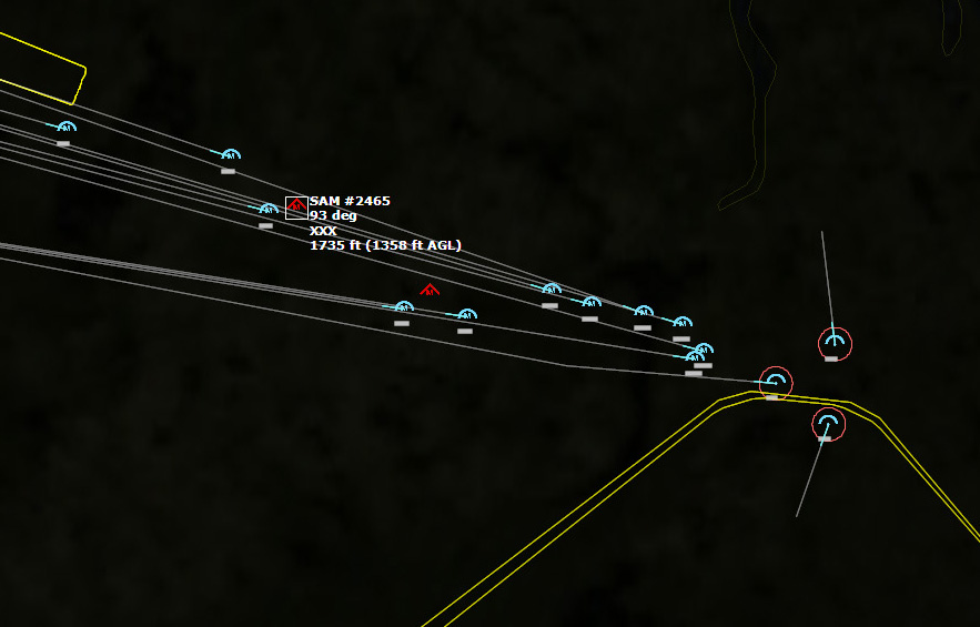Yarnell launches SAMs at the first two strike aircraft, while the second package approaches from the southeast. The two strike aircraft break right and left as the SAMs approach, successfully evading them. Yarnell immediately launches two more SAMs. The second pair of SAMs miss as well, and both aircraft turn away. Did they launch missiles? Looking at the database again, it's possible they launched AS-12 Kegler anti-radiation missiles, which have a 20nm range, and they just barely got that close to Yarnell before turning away.The new strike that my Tracer has detected is shaping up to be pretty scary--I detect no less than 28 aircraft headed my way. But right now I have to deal with the first raid.