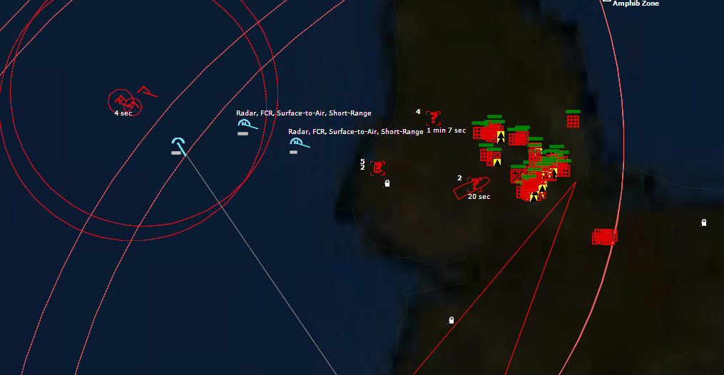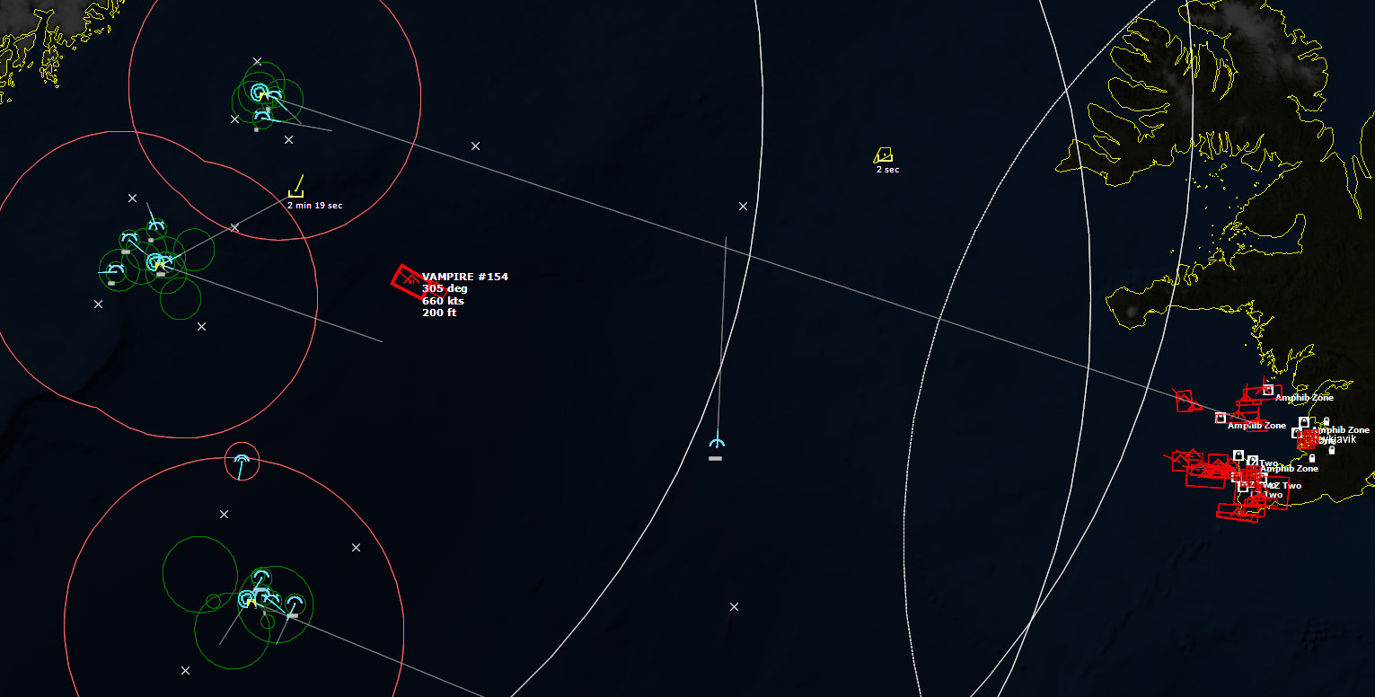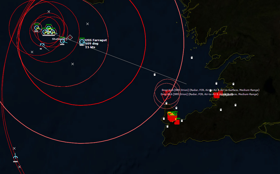 Eight Vampires inboundSoon after, USS Sellers also fires its SAMs. Most of the SAMs are shot down, but one gets relatively close to Sellers, and a volley from both Sellers and Yarnell bring it down.If the Soviets just launched a strike, their MiG-23 escorts will be out of action for several hours, so it behooves me to launch my own strike on Keflavik as soon as possible. But...
