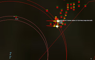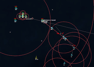 The Vampires close in...My Crusaders launch Sidewinders at the Floggers, but have very poor luck in hitting anything. Two Vampires close in on Yarnell, which resorts to firing its guns, while two SAMs from Farragut come to help.