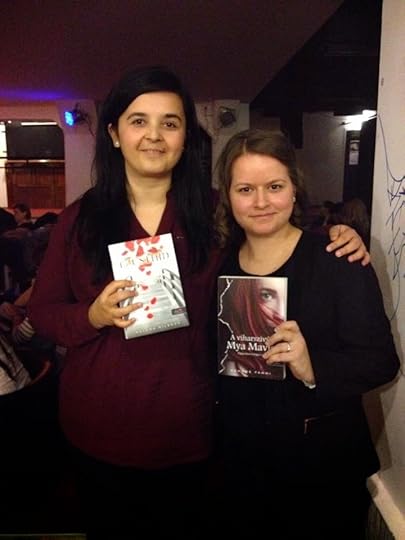 Hamarosan sorba rakták az ülőalkalmatosságokat, kipakolták az ellátmányt, és szép oszlopokba rendezték a könyveket. Volt fénypróba is, amiről lemaradtam, mert közben befutott Kitti barátnőm, és beültünk a nézők közé hármasban beszélgetni. Fannival készítettünk közös fotót, ami a fények ellenére talán nem is sikerült olyan rosszul, majd lassan elkezdődött a beszélgetés. Színes fények. Emelvény. Mikrofon. Megkönnyebbülés, hogy nem nekem kell először beszélni. Őszintén, alig emlékszem valamire az egészből, de lassan kezdenek visszatérni a részletek. Például, hogy az elején mennyi marhaságot mondtam. Hogy túlságosan őszinte voltam, így elspoilereztem a könyv felét. Hogy remegett a hangom, ezt biztos mindenki észrevette. Amikor nevetett a közönség, elsőként az jutott eszembe, hogy megint valami hülyeséget mondtam, de később rájöttem, hogy talán mégsem. A beszélgetés a felolvasásokkal együtt hamar elröppent, a dedikálás következett. Annyira kedvesek voltatok mindannyian! Megértően mosolyogtatok, amikor azt magyaráztam, hogy mennyire nem bírom az állandó fényképezést, és néha elfelejtek írni dedikálás közben. Ti vagytok a legjobb olvasók!Közben Fanni megmutatta, hogy ott vagyok a köszönetnyilvánításában a könyv elején, és ezen annyira meghatódtam, hogy majdnem megölelgettem. A közös írással töltött órák rengeteget segítettek az Ezüsthíd születésében, ezért örök hálával tartozom neki.