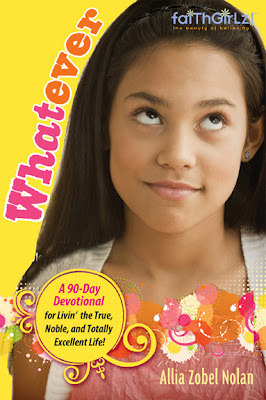 I'ts here. Mommy's new book, the one she's been working on forever (or at least two years) is finally coming to fruition (that's a sophisti-cat-ed way of saying "it's almost finished). Well, she's still working on the insides, but the outsides, the front and back covers, are finito. Yay. The name of this book is WHATEVER: LIVIN' THE TRUE, NOBLE, TOTALLY EXCELLENT LIFE, and though it doesn't have any cats in it, it is still way kewl. What's it about? Well, it's a 90-day devotional with Scripture and prayers and anecdotes meant to help tween girls keep their thoughts on things that are "true, noble, right, pure, lovely, admirable, praiseworthy, and excellent," instead of dumb, improper, and sinful. We'll be telling you more about it soon. And while we really can't take any credit for what's inside, we can say that we gave Mom moral support by sitting on her manuscript and laying all over her keyboard.