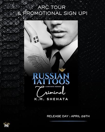 Criminal by K.M. Shehata Russian Tattoos Trilogy, Book 3 Genre: Dark Romance Releases: 4.28 Tropes: Kidnapped Heroine, Rival Pakhan, Obsessive Alpha, Loyalty at all costs, Secrets and Lies, She’s his weakness, Found Family, He would burn the world for her SIGN UP ↳ https://bit.ly/CriminalReleasePromotion