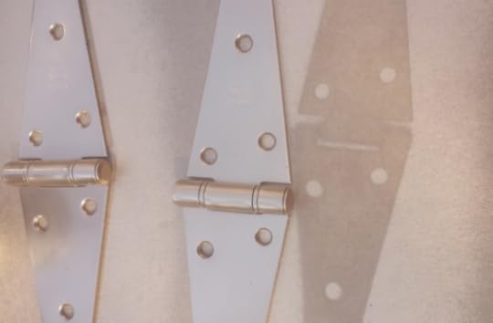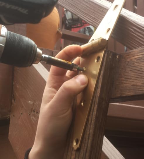**There were no Brass Hinges available when we went to Lowe's. So we bought 2 steel hinges and spray painted them to match the rest of the brass hardware.