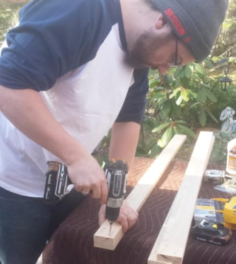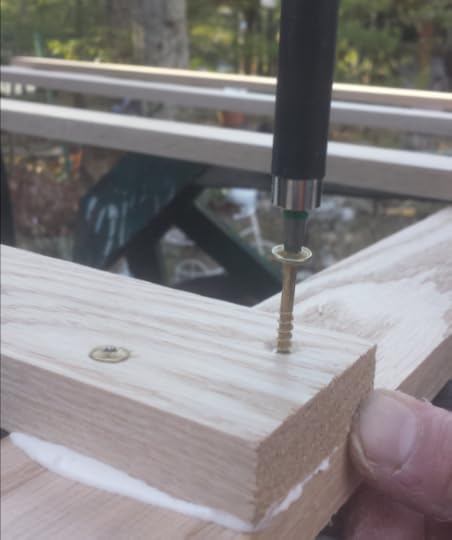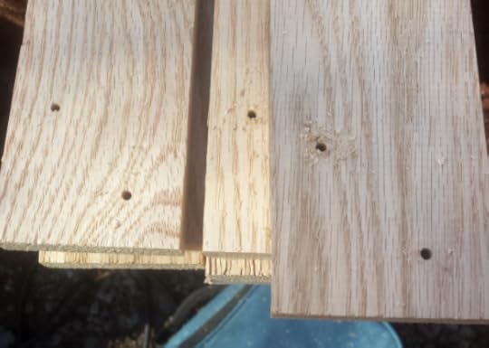 4. Pre-drill holes for screws. You want to drill with a bit smaller than the screw. Pre-drilling prevents the wood from splitting. James chose a diagonal pattern for the screws, but they could be straight across.