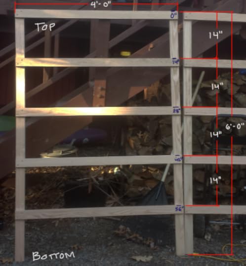 5. Mark 0", 14", 28", 42", 56" down from the top of the 4 - 6' pieces (see diagram below). These marks will be where you place the top of the horizontal 4' pieces. There will be 5 horizontal and 2 vertical piece per side. Apply a little wood glue* and screw in the 4 brass screws, 4 on each horizontal piece, 2 on each side, to each of the 10 horizontal pieces.