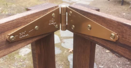 9. Attach the 2 hinges onto the inside top of the rack. Use 1 1/4" screws where the 2 pieces of wood overlap and 3/4" screws where there is just the vertical piece.