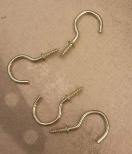 10. Pre-drill 4 holes, one on each of the 3/4" side of the vertical pieces for the cup hooks. screw in the cup hooks by hand.