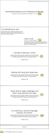 In order to have a decent site, I need to be able to design one. I know a couple of things about modern trends, but not enough. More study is required – at least two or three courses about web design, web development, usability, and very important, how to choose a good color scheme (you may laugh; I know I did it when I heard myself).Then I need to be able to build a WordPress theme from scratch, so I need to learn that too.Then I need to find some good pictures for the home page and for the articles. That’s even more wicked. What looks relevant today, becomes out of tune and dull the next time when I look at them! What should I do?I could have asked a professional web designer to build me one, but, as an Agile Coach, I have learned that bringing a technical expert does not help when the product vision is still unclear.