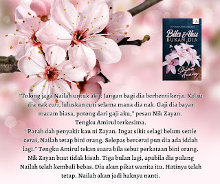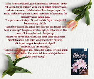 “Awal balik hari ni Nailah,” Tegur Encik Nik Zayan.Ketika itu Nailah sedang tunggu lif untuk turun.Nailah melihat ke sebelah. Dia senyum hormat kepada orang yang menegurnya.“Encik Nik pun awal jugak balik,” balas Nailah.“Terpaksa. Petang ni saya kena pergi blind date. Kalau tak pergi, nanti umi saya berkampung dekat office ni pula.” Adu Nik Zayan secara berseloroh.Hahaha... Nailah ketawa dengan penjelasan ikhlas Nik Zayan.Nik Zayan terpesona mendengar tawa itu. Ditarik nafas, tapi dia sedar Nailah ini isteri orang.“Dia tak sabar nak bermenantu dan bercucu tu Encik Nik. Tak patut hampakan hasrat orang tua ni.”Nik Zayan mengeluh. Tangan memicit dahi menunjukkan dia pening kepala dengan permintaan uminya yang satu ini. Dia langsung tidak ada keinginan berkeluarga, melainkan.... mata melirik kepada Nailah sebelum berkata;“Bukan sengaja tapi nak buat macam mana, saya tak jumpa lagi gadis yang mampu buat saya terbuka hati berkahwin.”Dia yang terlewat kenal Nailah.“Mungkin sebab Encik Nik letakkan syarat tinggi kot.”Nik Zayan geleng kepala. “Tak jugak. But something not right. Adakala tu saya rasa macam rindukan someone, but saya tak tahu siapa. Sampai hari ini saya tertanya-tanya dan tercari-cari.”Lif sampai dan terbuka. Mereka sama-sama melangkah masuk ke dalam lif. Lif kosong dan hanya ada mereka berdua sahaja. Perbualan mereka bersambung.“Perasaan Encik Nik je tu. Saya pernah rasa macam tu. Rindukan someone tapi tak tahu siapa.”“Aik... bukan suami awak?”Nailah tarik senyum segaris. Rindu itu lain dari rindu kepada suaminya.“Bukan, lain. Sebab itu saya kata mainan hati Encik Nik. Benda tu imaginasi hati sahaja.”“Mungkin betul cakap awak tu.”Ding.. pintu lif terbuka dan mereka sampai di lobi.“Good luck. Semoga Encik Nik tersangkut jodoh kali ini.” Ikhlas Nailah mengucapkannya.