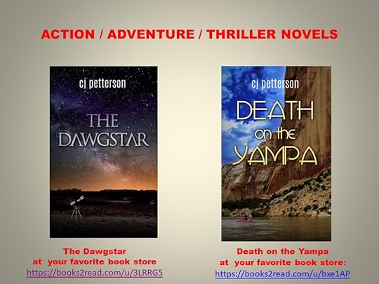 My fast-paced novels, TheDawgstar and Death on the Yampa,are available on Amazon or through your favorite e-Tailer and bookstore.