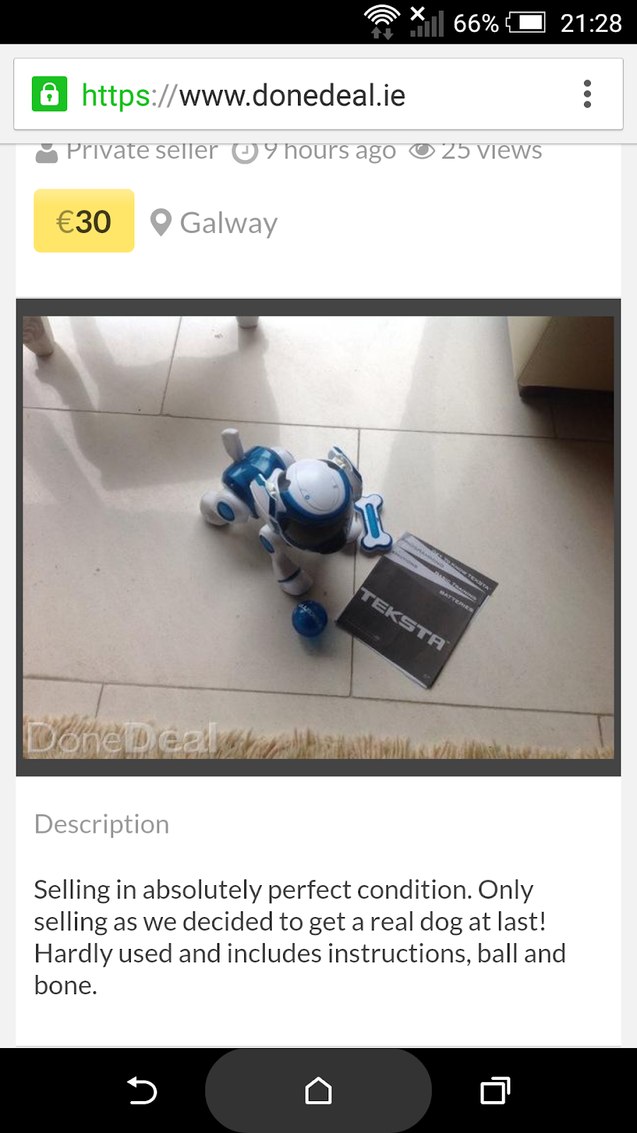 As usual, I was welcomed as a new customer, with the gift of a shiny new smartphone. Now, I’m quite tech-savvy, particularly for someone who grew up long before the interweb thingy was a glint in Mr Tim BL’s eye. That being said, I was still pretty impressed with the capabilities of my new HTC phone and enthralled with its numerous exciting but utterly pointless features. On the other hand, I’m nearly as paranoid about my privacy as a pot-smoking spy. So it might surprise you to learn I didn’t follow my usual protocol of disabling every feature and only using my phone for making calls, sending texts or as a glorified paperweight.With the clever interactive features enabled, HTC soon became my virtual friend, watching my every action and making useful suggestions. Consequently, just after I had casually searched for one of those drone helicopters, as a gift for my son-in-law, my smartphone enthusiastically took up the challenge and started bombarding me with suggestions as to how I could spend my money on unrelated electrical items.“I see you were searching for a drone helicopter,” HTC said, “perhaps you might be interested in this robot lawnmower?”“Not really,” I laughed. “That’s a 12-inch solar-powered lawnmower, fine for a tiny back garden in sunny Surrey, but hardly suitable for four-acres of wet meadow grass in rain-lashed Ireland.”A few minutes later, my phone pinged again.“I see you were searching for a drone helicopter,” HTC said, “perhaps you might be interested in this remote controlled car?”“No thanks,” I tutted, whilst surreptitiously trying to figure out what ‘push notifications’ were and if I should turn them off. Before I could, my phone pinged again.“I see you were searching for HTC phone instructions,” HTC said, without a hint of irony, “perhaps I can interest you in this advert for an HTC phone.”I involuntarily ground my teeth and politely declined by banging my new HTC phone on the table. Lesley glared at me. Nevertheless, a few moments later, my phone pinged again.“I see you were searching for electrical items,” HTC said, “so perhaps I can interest you in this electric dog.”“What?”“An electric dog,” HTC casually repeated.“You’re kidding me,” I said.“I kid you not – it’s an electric dog.”“Show me.”And it was…