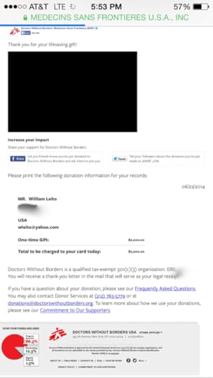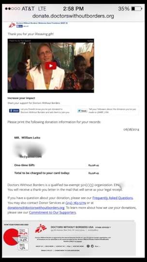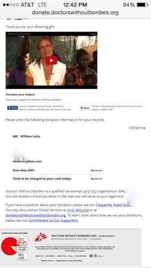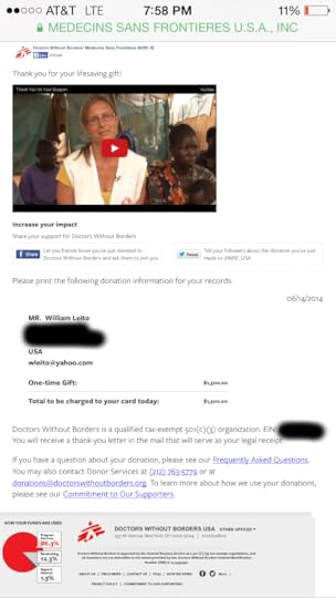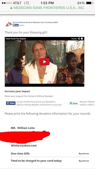 I will attach two photos of donations to this post. After this, I will still owe Doctor's Without Borders $3,000 and will pay this as soon as I can get the funds transferred to the appropriate account.