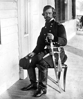 Union General Isaac Stevens seated on a porch in March of 1862 near Beaufort, South Carolina. During the Battle of Chantilly, fought on September 1, 1862 to cover Pope's retreat after the disaster of 2nd Bull Run, Stevens rallied his men by picking up the fallen regimental colors of his old regiment and shouting "Hightlanders, my Highlanders, follow your General!" Charging with his troops while carrying the banner of Saint Andrew's Cross, he was struck in the temple by a bullet and died instantly. General Stevens was held in such high regard, that before his untimely death, there was speculation that he would soon be elevated to command the Army of the Potomac.