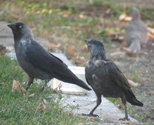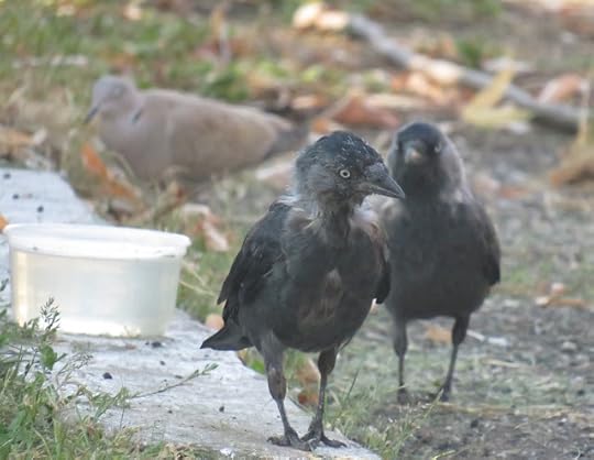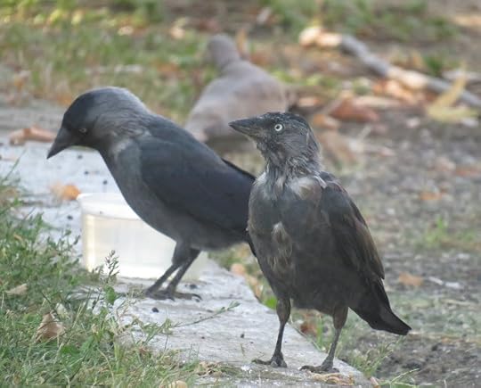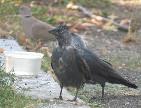 Puiul de stăncuță cu unul dintre părinți și un vecin guguștiuc în spate: