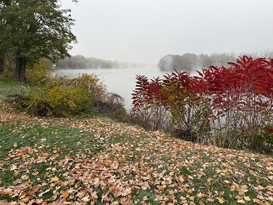 [On the left, in the distance, just beyond the white house, just hidden in the morning fog, is the riverbank where I played away my childhood. Photo is mine.]