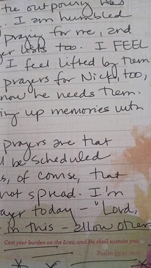 When friends share Bible verses with me in cards and notes, some go next to my journal. Others find a home between pages of my bible. During those inevitable dark nights of the soul, I have helpful verses handy. One thing I’ve noticed in recent days is how lifted I feel, knowing others are praying for me. There is a power in their prayers. The power to lift, to encourage. Maybe, to change outcomes. Surely to change me.