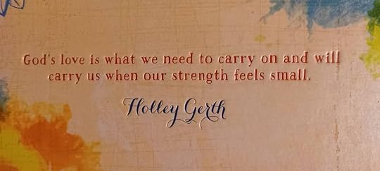 Let His presence cast out any weakness and guide you through every circumstance and decision you face. Be strong in the Lord, and may His unfailing love guide your heart into a fearless future. I turned to the back cover and noted the quote by one of my favorite authors, Holly Gerth. God’s love is what we need to carry on and will carry us when our strength feels small. Ah, yes, this spoke to my heart too.