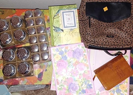 And yet, I was surprised. In fact, I may have gasped in awe when I spotted two new packages of parmesan cheese shakers and a new package of glass salt and pepper shakers. I mean, come on, what are the odds? Within a day or two of confidently assuring my husband God would provide those items, He did. Not only that, but my Goodwill stop netted the exact type of backpack my husband had suggested I get for our future trips, in lieu of carrying a purse. One of my favorite brands, and in my signature leopard print! A Relic backpack for $6.00? The stationery sets and leather book of prayers for my husband were just icing on the cake. Not pictured are several items I purchased for Christmas gifts.