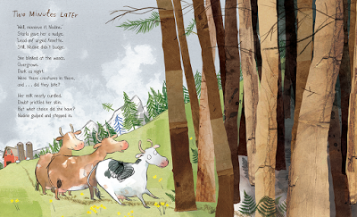 The lead character was always a cow. But I couldn’t find the story that suited her. What came to me suddenly (after years of other possibilities that didn’t pan out) was that I had to get her out of her element. Like … into the woods? Every version of the story was written in rhyme, so I basically just kept building and playing around with it. And deleting. Lots of deleting.