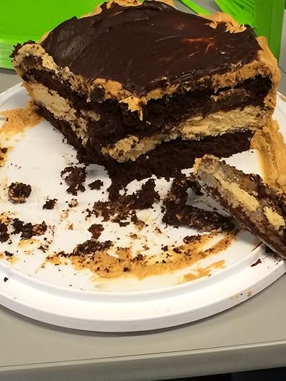 Anyway, one thing I've been wanting to post about is the cake I made for my coworker at the end of June. Way back in May she told me she wanted a chocolate and peanut butter cake. So my plan was to make the chocolate cake from my birthday cake (because it is the most amazing cake ever) and the peanut butter frosting from these brownies. But then, less than a week before I planned to make the cake, I found a recipe for a buckeye cake. As a good former Ohioan, I could not ignore this, so I decided to add the peanut butter cheesecake layer and the chocolate peanut butter glaze to my original plan.