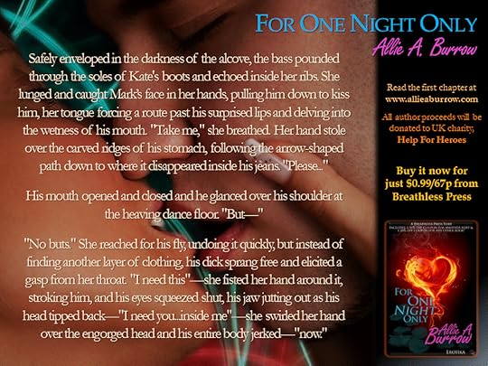 Following the closure of Breathless Press last year, both of my titles were regrettably removed from sale. Well, I am delighted to announce that For One Night Only is now available once again and is still only 99c/99p with all proceeds going to Help For Heroes .