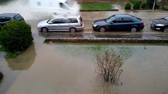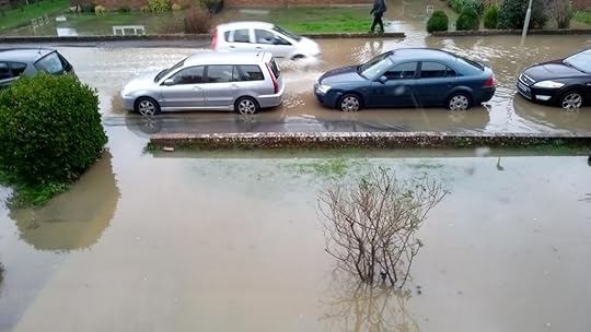 The photo was taken last Monday just before the sandbags came out. This driver was considerate and went slowly. Here’s a photo of what happens when you drive fast! Apart from drenching pedestrians it sends big waves across the gardens, swooshing flood water ever closer to people’s doorways.