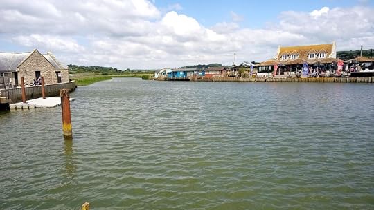 But back to the photo: from here, you can take a boat upstream through meadows and under the bypass bridge to Palmer’s brewery, where the water runs shallow. Above this is a weir (featured in my novel, The Chicken Soup Murder). The weir marks the confluence of two rivers: the Brit and the Asker, which pass either side of the oldest part of Bridport.