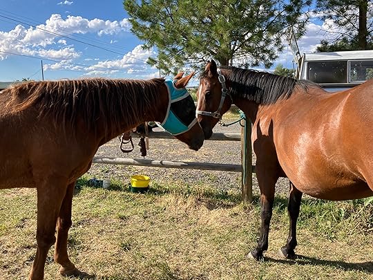 Another incident. I was working on tying a hay net to the fence while on the phone, when I felt the soft brush of a nose on my neck, from behind me. Again, allowing this behavior is an exercise in trust—and it was one of the first ways that Marker showed his trust in me. He first did this four months after I bought him, during a moment when I was yelling at another horse who was kicking at my old mare. Marker slipped in behind me and briefly rested his chin on my shoulder—reassurance to me, or seeking it from me? I’m not sure. In any case, it was just a light touch, and he moved away without running into either me or Mocha. Since then, he’ll often give me an unsolicited light touch on the neck or shoulder. Very light, sometimes a request to exchange breath, then move away. No squealing, no striking, just—checking in.