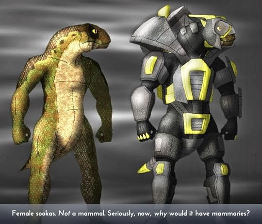 Here's where it gets interesting, though, because they're mainly based on komodo dragons, quite possibly the most awesome lizard alive on Earth today (crocodiles and alligators aren't lizards, they don't count). Komodo dragons are fascinating animals, too, because they've recently been shown to be capable of parthenogenesis, of reproducing without a male, and since no-one in the Cynos Union has ever seen a male sookas (and it's long been theorised that the sookas may in fact be a mono-gendered species), would you like to take a guess on how these big, ugly aliens reproduce?