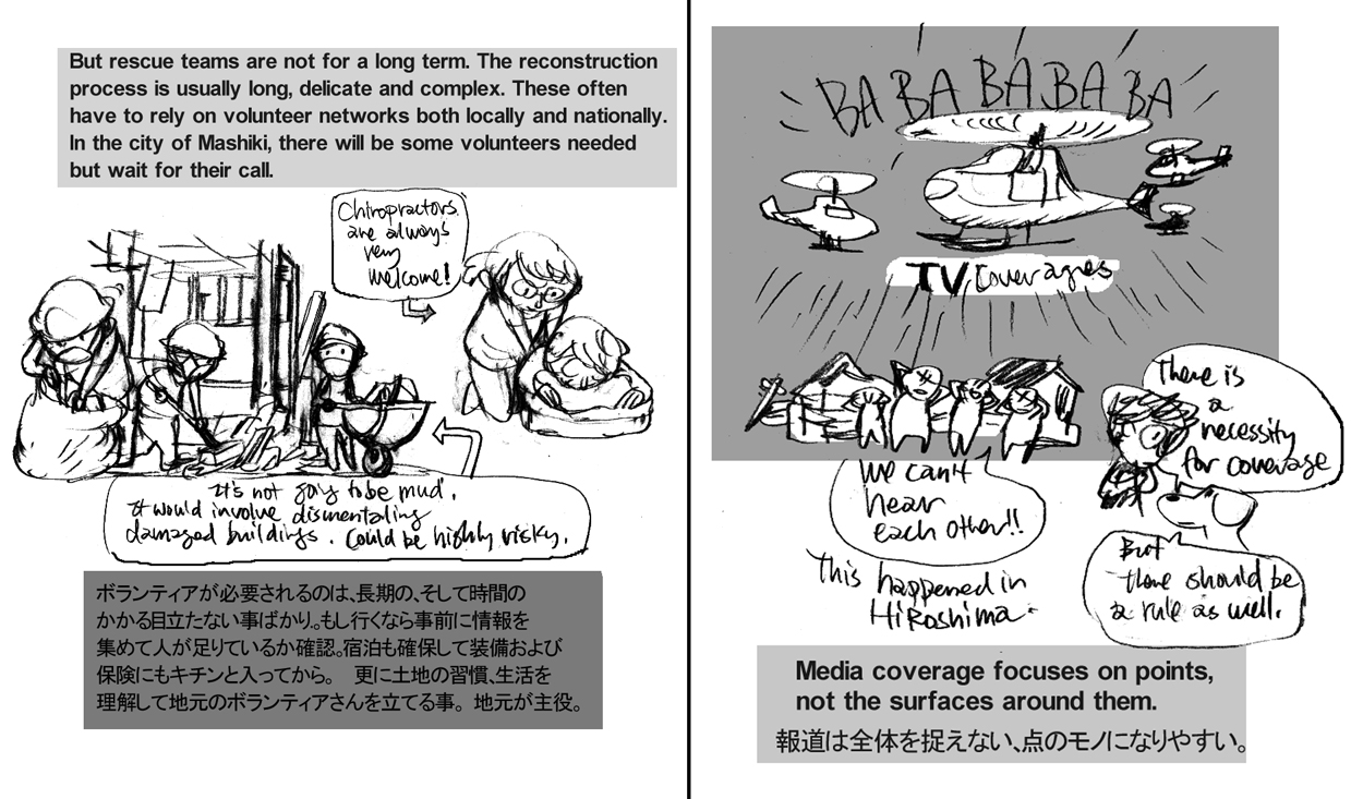 My thoughts and reflections over the earthquake in Kumamoto, south of Japan.The shake hasn't calmed down....Remembering 5 years ago about the triple disaster in the north of Japan.Huge aftershocks still going.The situation seems changing. 熊本の被害の全容が見えてきたなか、浅い経験と合わせて描いてみました。しかし余震の続く被災地では今だ緊張が続いている。