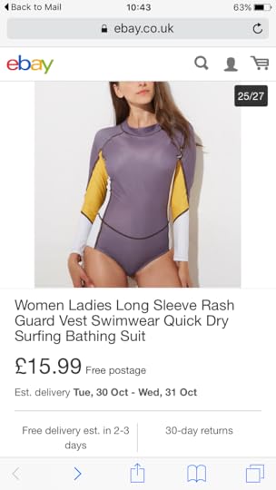 And then my zip broke on my swimsuit, the long sleeved swimsuit that mad friend Milly had bought me and that had been working rather well. So I messaged her, asking her where she'd got it. The conversation went something like this."Ha ha, did your boobies fly out?""No I wasnt wearing it at the time!""Shame! Just google sexy rash vest eighties style, on ebay"She then sent me a photo