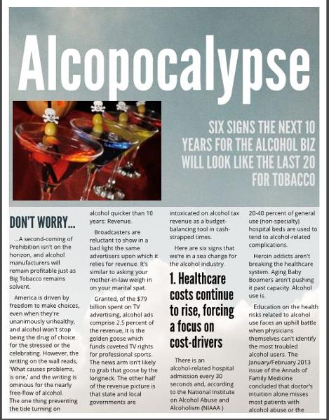 The whitepaper, Alcopocalypse, predicts the next 10 years for the alcohol business will look like the last 20 have for tobacco. Alcohol's causal relationship with breast cancer isn't new. More than 100 studies 1920-2017 have conclusively linked alcohol consumption to increased breast cancer risk. New research continues every year, delving deeper into the link, especially how alcohol disrupts hormones and even genes.