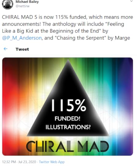 My story “Feeling Like a Big Kid at the Beginning of the End” (written during the first few weeks of the Covid-19 lockdown here in the States, when my county decided to extend Spring Break and “see what happens”) will be appearing in Chiral Mad 5, due out sometime in 2021 by Written Backwards and curated by my long-time (and long-suffering) editor Michael Bailey.