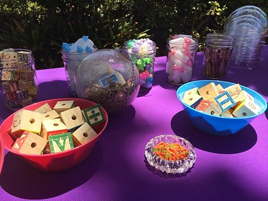 For snacks, we went with stuff E thought hamsters might like, based on her knowledge of hamster from obsessively reading Humphrey the Hamster books. Knowledge which may or may not be accurate...but whatever, we went with it and it looked super cute! Pretzel sticks, popcorn, carrot and celery sticks...all easy stuff to arrange in mason jars so the kids could grab what they wanted. For both the craft and snack tables, I hand-lettered signs using purple paint and cardboard. We also did an "adult food" table and switched out the carrots, etc for a tower of mini purple and brown cupcakes (red velvet and chocolate-chocolate, E's specific request) when it was time for cake.