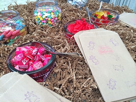 The final touch to our hamster birthday party was a candy station customized with all of E's favorites (and some of mine!) We wrapped wide mouth mason jars and some glass vases we had around the house with baker's twine and filled them with an assortment of small candies. E and N had a blast stamping kraft paper bags with a hamster rubber stamp and the words "Happy Birthday." As each guest left the party, they got to fill a bag with some sweet treats.