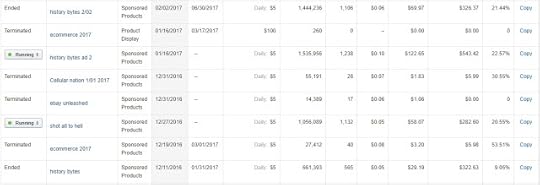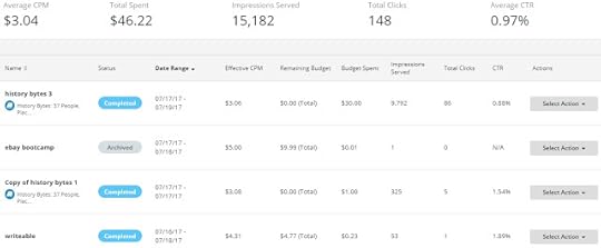 Here's a chart showing the results of ad campaigns for my two most popular books - History Bytes and Shot All to Hell. If you look closely you will see three separate campaigns have gotten over one million impressions. Better yet, they have made some great sales.