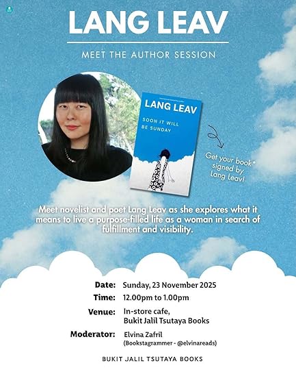 ✨Join internationally bestselling poet and celebrated novelist Lang Leav for an intimate afternoon of conversation and reflection on her latest work, Soon It Will Be Sunday.📅: Sunday, 23rd November 2025🕓: 12.00pm – 1.00pm📍: Our In-store Café🎤 Moderator: Elvina Zafril (@elvinareads)Through her signature blend of poetry and storytelling, Lang will explore themes of purpose, creativity, and self-discovery — and what it means to find meaning and visibility in a world that often overlooks quiet strength.📚 This is your chance to purchase a copy of Soon It Will Be Sunday for signing by Lang Leav! FREE entry, no pre-registration is required and walk-ins are welcome on the day too (seating is limited to 20 pax first-come-first-serve basis, subject to availability).—📍: Level 2 (Orange Zone), Pavilion Bukit Jalil📚⏱: 10.00am to 10.00pm, Mondays to Sundays (7 days)☕️⏱: 10.00am to 10.00pm (last call 9.00pm), Mondays to Sundays📞: +603-8080 0365 (during business hours)#bukitjaliltsutayabooks #tsutayabooks