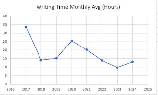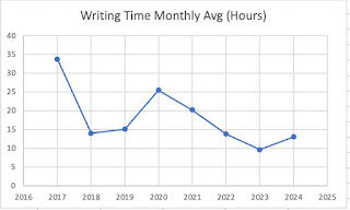 Time Spent Writing: Last year I noticed a distinct and disturbing downward trend in the amount of time I'd logged writing. I keep track of my writing time, as I do for other things that it's easy to fool myself about, so I knew that my sense that I wasn't writing, even though I wanted to, was real. I have done better this year, as can be seen in this graph. There's still a ways to go to get back to those impressive numbers (achieved during the covid pandemic....probably not unrelated!) but I'm happy with the upward tick in the trend.