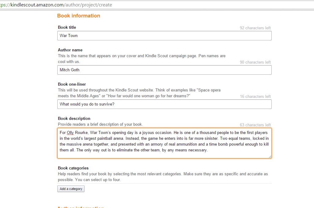 A writer, such as myself and some of you reading this, can submit a manuscript of at least 50,000 words in the genres of Mystery/Suspense/Thriller, general Literature & Fiction, Romance, Sci Fi and Fantasy, and YA/Teen. Along with the manuscript, you add it most everything else you would if you were publishing in the classic KDP style. Cover, one-sentence blurb, long description, genre and all that. Below you can see a snap of what the submit-page looks like. Any KDP authors out there will notice lots of similarities. Categories are the same, entries are the same, most everything is the same. But there are a few important differences. For one, you need a one-liner. And when they mean one line they mean it. It can only be a single sentence long. As you can see below, my short one-liner took up all but 16 remaining characters. Another big difference from KindleScout and KDP is the long-form description. You only get 500 characters which, if you know twitter, isn't much. Whatever book blurb you have might be way too long for KindleScout. If you're thinking of submitting to KindleScout, you'd better be concise with your blurb writing.
