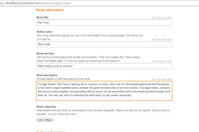 As for my book in particular, it just launched today! KindleScout let me know a day in advance when it would release so I could get my promotional ducks all in a row, which was nice. War Town officially launched into the 30 day (although it says 29 days left on the site) crowdsource publishing campaign. I'll be keeping up on blogging as the process goes on and I learn more about what all goes into KindleScout and how things go as the campaign gets further in. This was just an introduction, and I look forward to informing authors all around about KindleScout, so they can better decide if participation in the program is right for them or not. As I see it now, KindleScout is a cool new take on publishing, but doesn't seem like it would be right for every writer by any means, like people protective over their rights or writers in genres not represented by KindleScout right now.