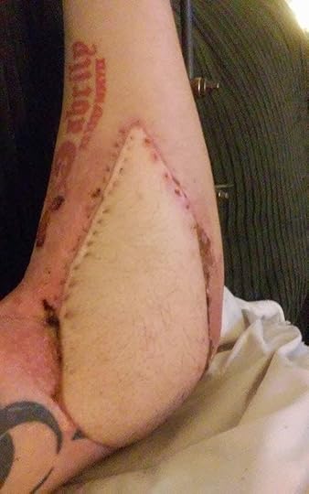 holding his arm togetherSo several operations, a graph from his thigh,  twelve days in the hospital, a $300,000 hospital bill (miraculously paid by a charity organization THANK YOU JESUS), and a trip to Houston, TX for THE BEST oncology clinic known to this modern mankind, he’s home. Chemo for 4.5 months is planned. Physical therapy for his reconstructed left arm.