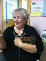 She's so sweet to me too. Janet Flick of Flick Kennels in Westcliffe. She allows me to come see "the twins," as they refer to my Nelli and Delli, anytime I want, during their customer's visiting hours 2:00 - 4:00 pm.  She doesn't rush me. She sits with us and visits with us, answering our multitude of questions. And we discuss other things too. She is teaching a Fidget Quilt class at the Westcliffe college. That's a quilt with various textured fabrics, what nots sewn in for Alzheimer's patients to lay in their lap and "fidget" with. It's very soothing for the recipient and I wish I'd had one or two for Mom when she lived with us. (BTW Alzheimer's is a terrible disease!!!)