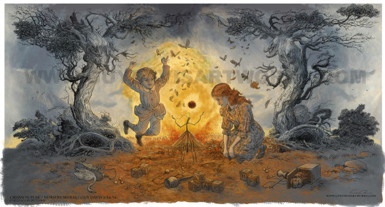 Happy Holidays and yuletide cheers to haunted Victorian spirits everywhere! Along with working on concept for the ghosts in Crimson Peak and some set and prop design, I also got to work on a few murals seen in the film! Below is the illustration I did for the nursery at Allerdale Hall (separate images like the figures and trees were done in pencil and then combined and painted digitally). Guillermo asked for it do be done in a Arthur Rackham-esque style, with the center insect as a nod to Pan’s Labyrinth. Like other aspects in the film, the word “fear” was also hidden in different parts of the illustration too!