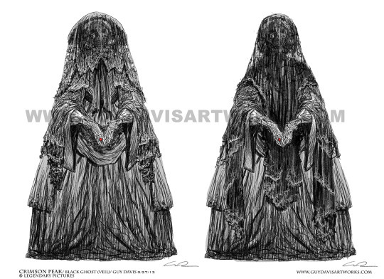 In honor of Mother’s Day~ here’s some concepts I did for Edith’s mother from Guillermo del Toro’s film, Crimson Peak! Originally she was only labeled as “Black Ghost” to set her concepts apart from the other red clay designs we were working on. Since the ghost of Edith’s mother was more costume based, early on I worked with the incredible costume designer Kate Hawley on different types of layering and forms to work out an iconic shape. Below are the initial concepts as they progressed.