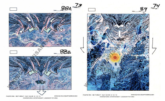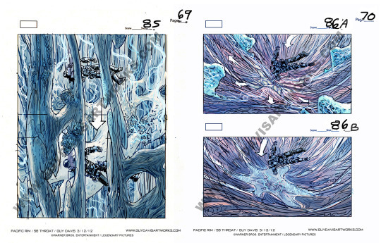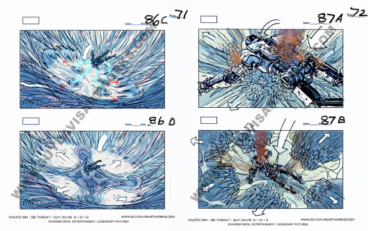 Along with working on concept for Guillermo del Toro’s PACIFIC RIM (you can read about my kaiju designs for Otachi and Slattern here) and some prop work, I also worked on storyboarding the film with Rob McCallum, Francisco Ruiz Velasco and Raúl Monge. Below are a few sample pages to some of the sequences did.
